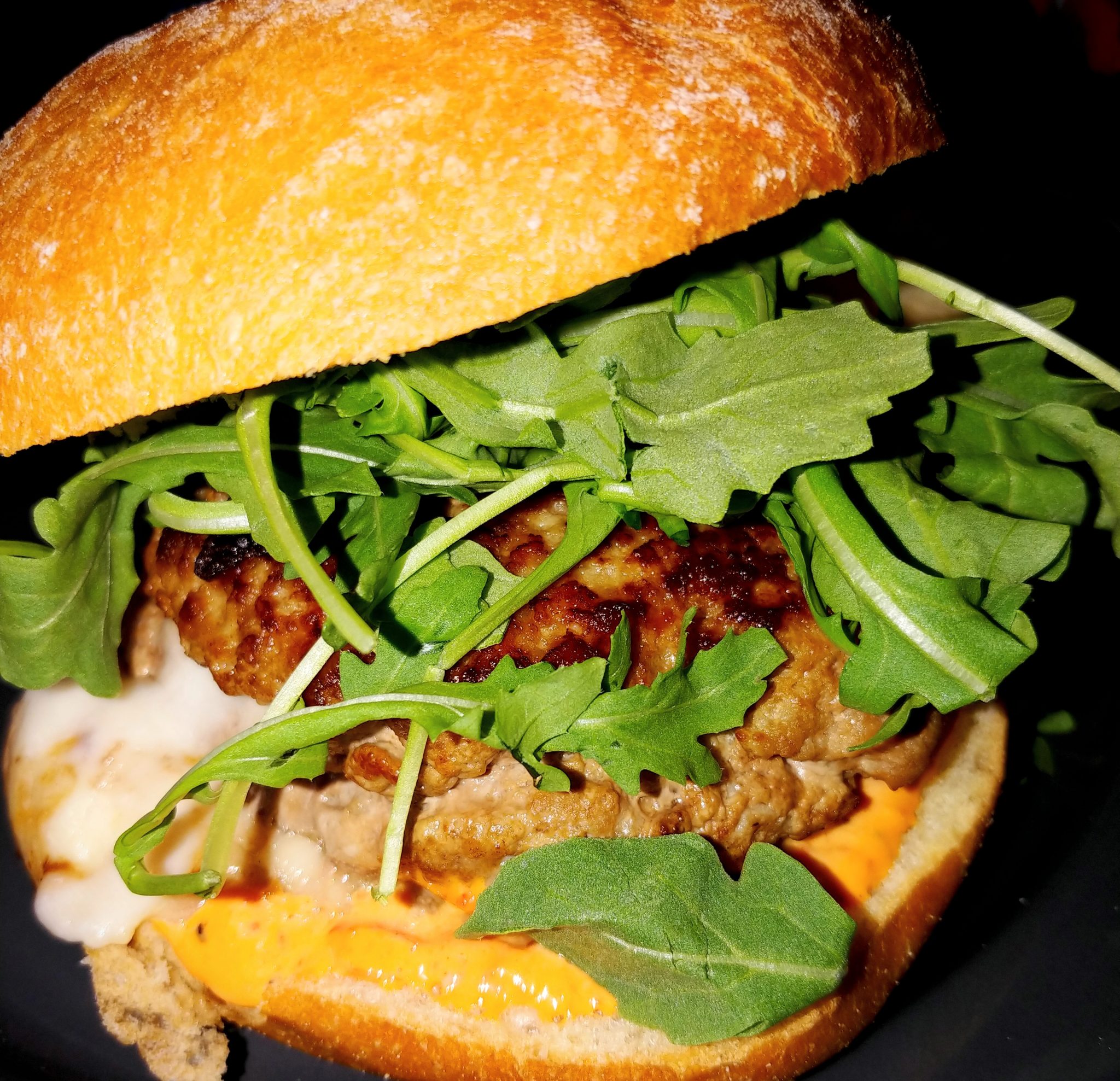 To assemble the burgers, spread half of the pesto on the bottom side of each bun. Top each bottom half with a turkey burger and half of the arugula. Spread the Mayo on the top bun halves and finish off the burger stack!