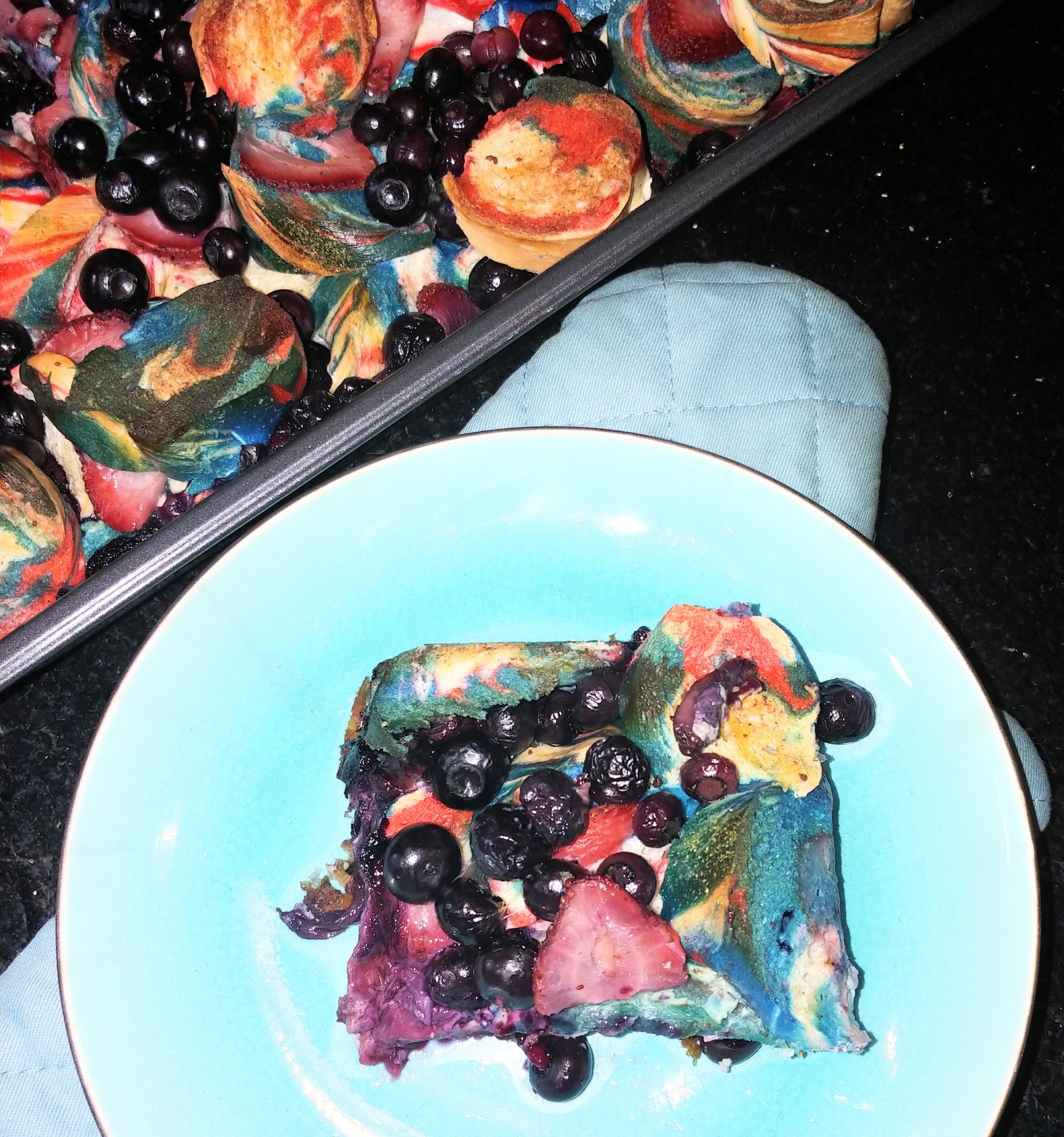 This is no ordinary baked overnight French toast recipe. Instead of using stale French bread, or slices from a loaf, this recipe uses bagels! For Independence Day this year I ordered bagels from “The Bagel Nook” in New Jersey. Normally I would just grab a container of plain white bagels from the store but The Bagel Nook does the cutest seasonal bagels, to which these happened to be red, white and blue tie dye. I love buying fresh ingredients from around the US from Goldbelly as a way to spice things up, and I just had to have these. The fruit I chose when I made this was blueberries and strawberries just to keep with the patriotic vibe, but you can really use any of your favorite fruits that bake well.